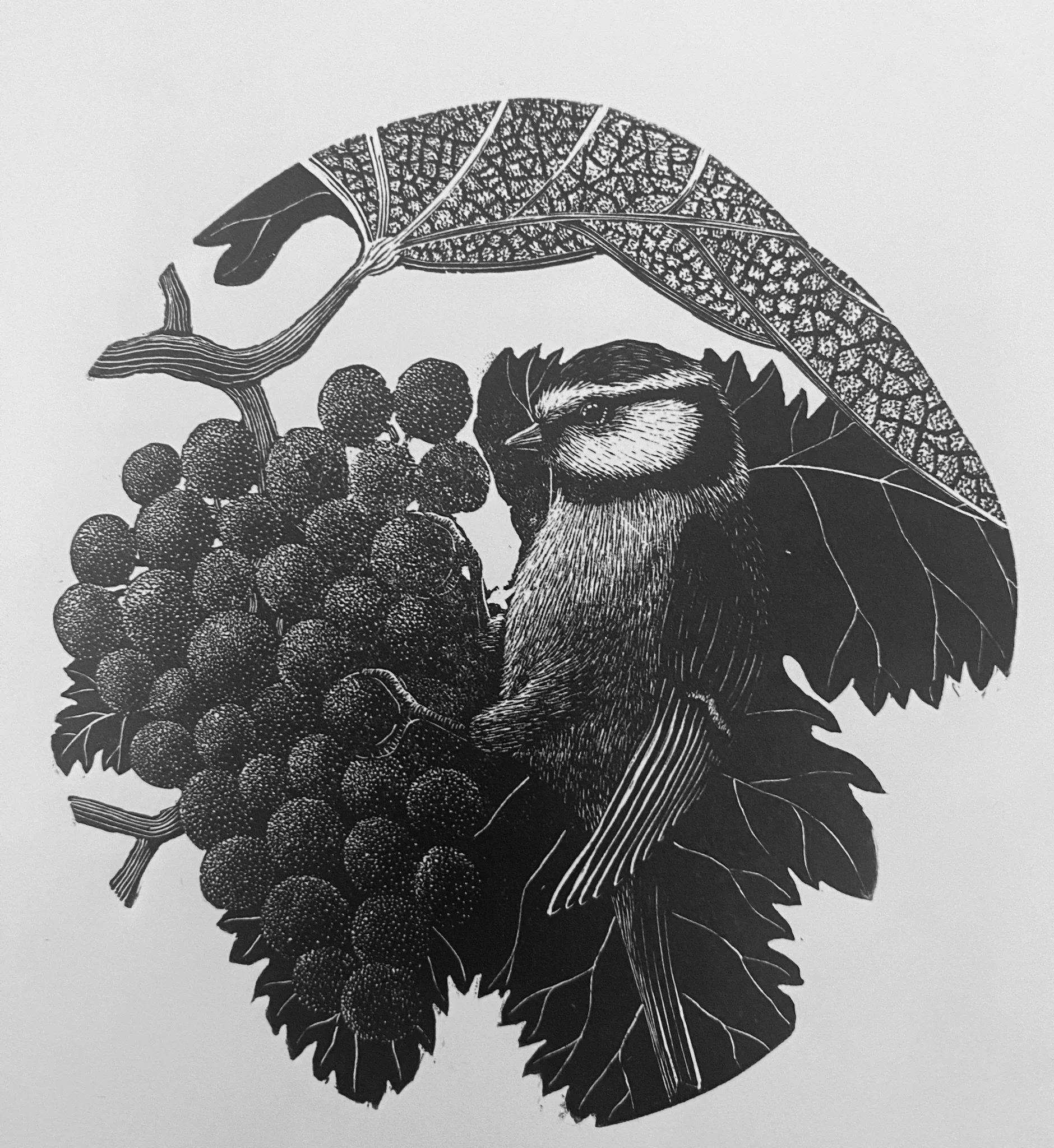 This engraving was inspired by watching a bluetit feeding on a small bunch of grapes hanging near my kitchen window. It is engraved onto a piece of boxwood that was growing in our garden for around 100 years, the wood was seasoned for 10 years, then made into engraving blocks by Chris Daunt.
