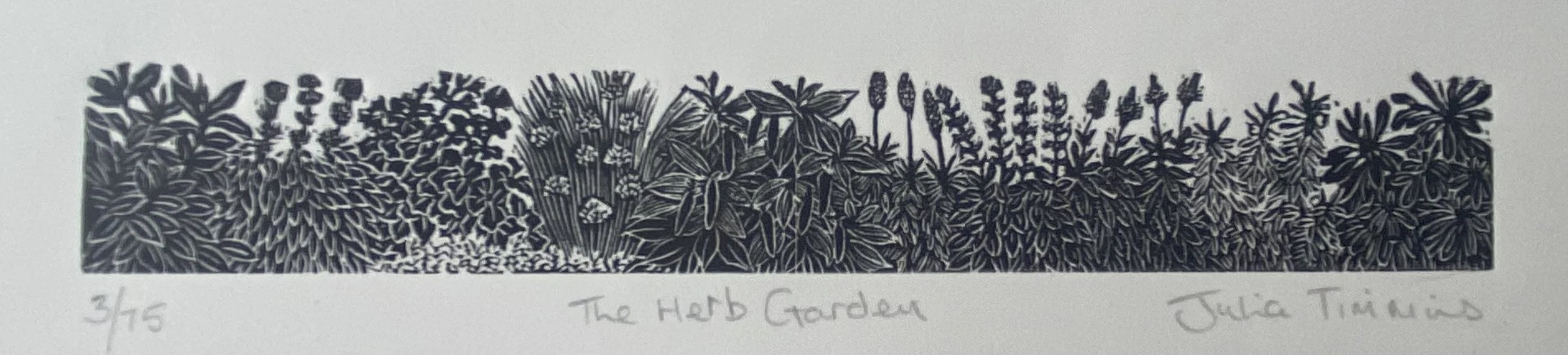 This engraving shows the herb box growing outside my kitchen window, I look at it all the time while I am making coffee or tea and enjoy its variation through the seasons.
